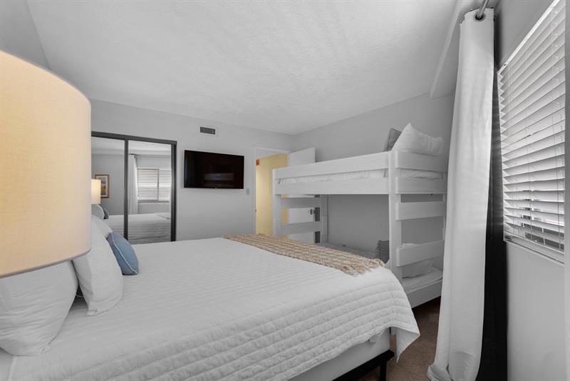 There is a white-washed Deacon's bench at the entry of the condo. The condo has a king size bed in the master bedroom, and a king bed plus a set of twin bunk beds in the second bedroom. The condo has flat screen televisions in the living room and both bedrooms.